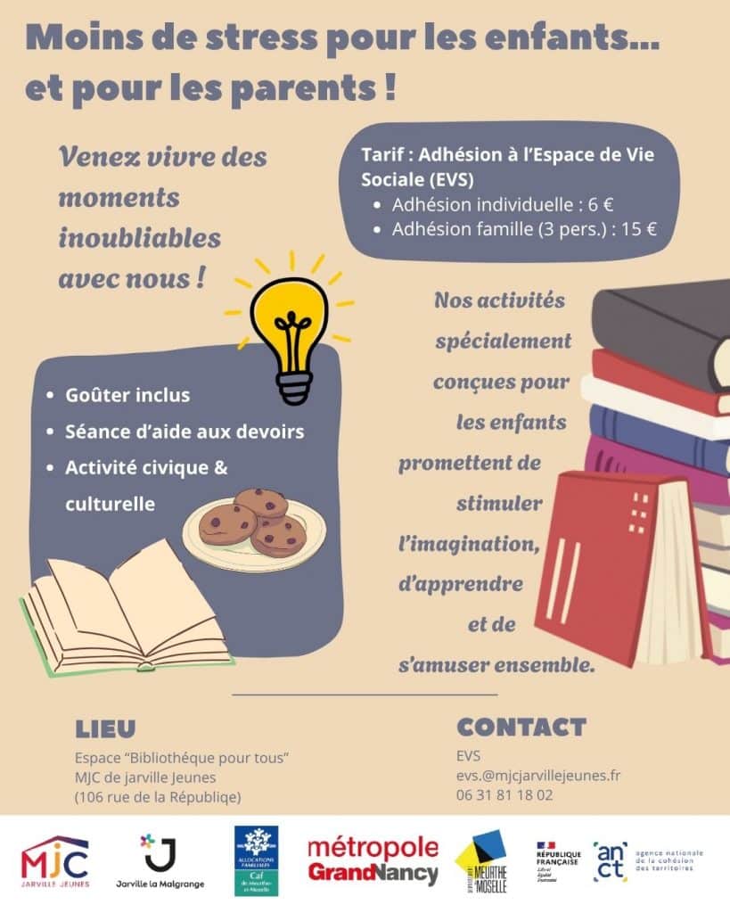 Un dispositif bi-hebdomadaire dédié aux enfants en élémentaire de Jarville, pour les aider dans leurs devoirs, consolider leurs apprentissages et renforcer leur confiance scolaire.